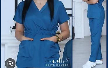 - Qadınlar üçün mavi rəngli tibbi kostyum: V-yaka, qısaqol üst və düz kəsimli şalvar. Üstdə yanlarda dərin praktik ciblər, bel hissəsində elastik yığma və bağlama ipləri ilə tənzimləmə. Şalvar rahat hərəkət üçün klassik düz kəsimdədir. Parça nəfəsalan, günboyu rahatlıq üçün yüngül və elastikdir, tez quruyur, asan ütülənir.