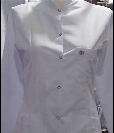 - Ağ rəngli tibbi xalat: Mandarin yaxalı, qısaqol, ön tərəfdən düymə ilə bağlanır. Döş cibinə sahibdir, səliqəli siluet verir. Laboratoriya, klinika və stomatologiya mühitləri üçün uyğundur.