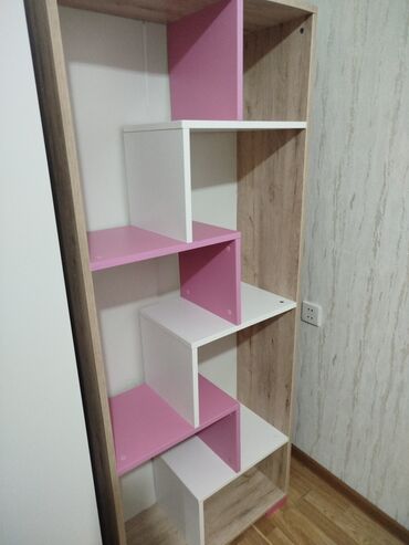- Açıq kitab rəfi: ağ və çəhrayı rəng kombinasiyalı, mərtəbəli dizayn. Kitab, oyuncaqlar və aksesuarların düzümü üçün müxtəlif ölçülü bölmələr.