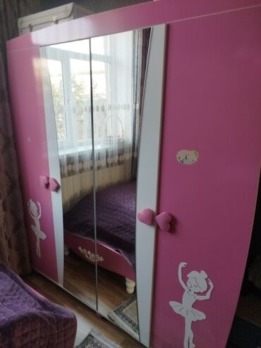 Uşaq otağı üçün mebel dəsti - Tək nəfərlik çarpayı: ağ rəngli başlıq və ayaqlıq. - Dördqapılı paltar dolabı: açıq krem, çəhrayı və göy panellərin kombinasiyası ilə modern dizayn. Hündür və geniş s...