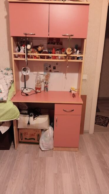 - İş masası-üst dolablı: yazı masası səthi, sağ tərəfdə çekmece və qapılı bölmə, üst hissədə 2 qapılı asma şkaf, açıq rəf bölmələri.