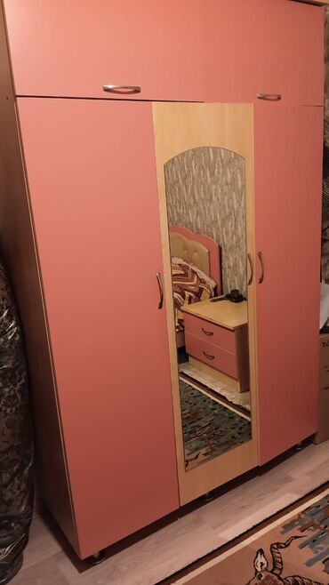 - 3 qapılı paltar dolabı: ortada böyük güzgülü qapı, yuxarıda əlavə saxlama bölməsi; hər qapıda metal tutacaq.