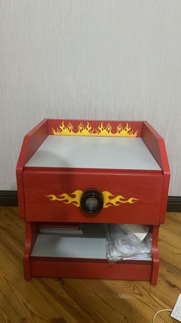 - Tumbo/komod (yataq yanı stol): Qırmızı-gri kombinasiyası, alov naxışları, mərkəzdə təkər formasında dekor element. 1 dartılan çekmece + aşağı açıq rəf, üst hissə geniş qoyuluş sahəsi.