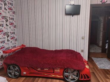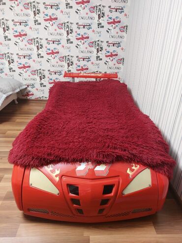 - Çarpayı: Qırmızı rəngdə, idman avtomobili formasında korpus. Ön paneldə faraları xatırladan dekor, yanlarda iri “disk” təkər elementləri, arxada spoiler. Yanlarda alov və yarış temalı stikerlər. Standart tək nəfərlik döşək ölçüsünə uyğun (təxmini 90x190 sm).