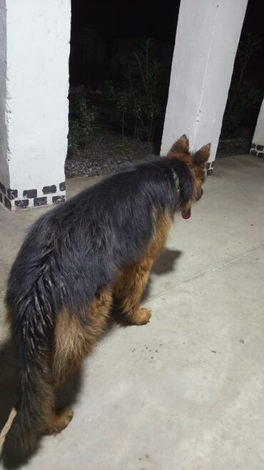 Alman çoban iti – uzun tüklü (long coat) tip - Cins: Alman çoban iti (GSD), uzun tüklü - Rəng: Qara-sarı (saddle pattern) - Cinsiyyət: Erkək - Qulaqlar dik, güclü skelet quruluşu, sıx və parlaq yu...
