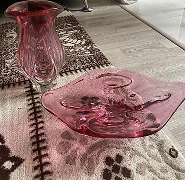 - Rənglər: çəhrayı tonlarda 1 ədəd vaza + 1 ədəd dalğalı formalı servis/konfet qabı; əlavə olaraq mavi-şəffaf keçidli böyük vaza və çoxrəngli (yaşıl, mavi, kəhrayı-sarı tonlarında) iki ədəd dekor qab