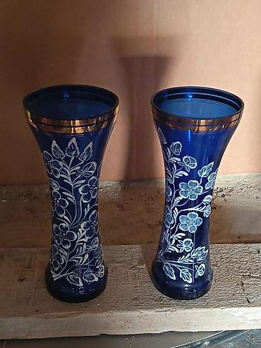 İki ədəd dekorativ şüşə vaza dəsti - Material: qalın keyfiyyətli şüşə - Rəng: kobalt-mavi korpus, üst hissədə qızılı tonlu bəzək - Dizayn: əl işi kimi görünən relyef çiçək naxışları, incə kontur v...