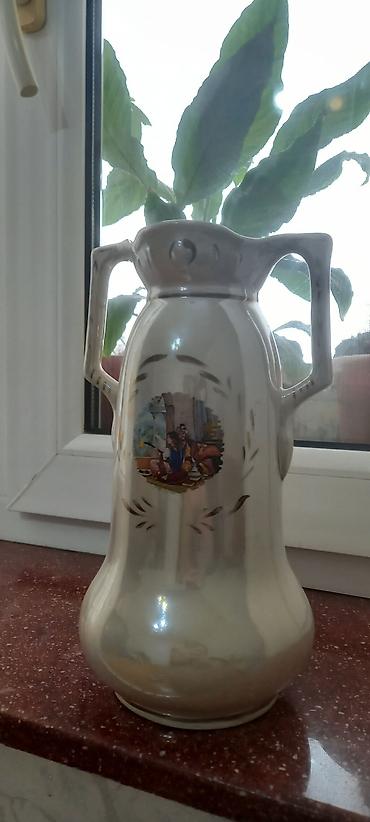 - Keramika sürahi/vaza: açıq bej rəngli parlaq glazur, iki simmetrik tutacaq, yumşaq dalğalı kontur. Ön hissədə klassik süjetli kiçik rəsm və ətrafında zərif dekorativ vuruşlar. Masaüstü və konsol üzərində dekor kimi gözəl görünür.