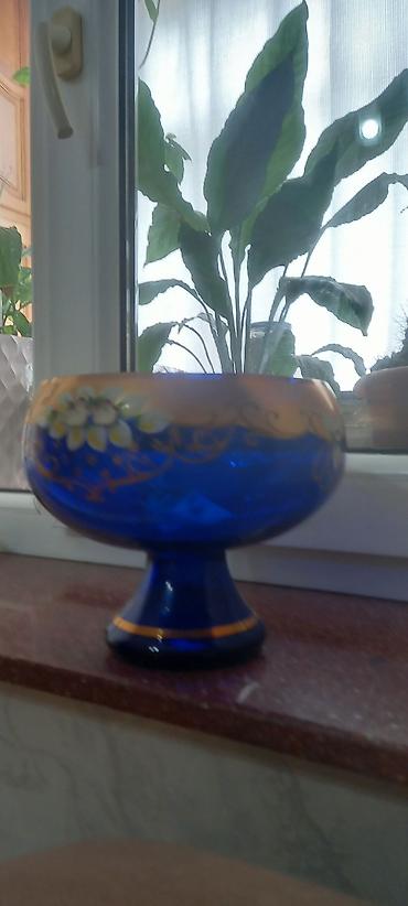 - Şüşə meyvə/qənd qabı, ayaqlı: kobalt-mavi rəng, qısa gövdə və geniş kasa. Üst haşiyədə qızılı ornament və çiçək aplikasiyaları. Süfrə servisində meyvə, şirniyyat və ya dekorativ kompozisiyalar üçün əlverişlidir.