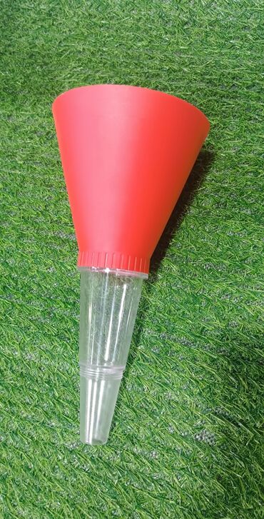 Avtomobil və ya digər mexaniki avadanlıqlarda yağ və ya maye dəyişdirilməsi üçün nəzərdə tutulmuş huni dəsti. Qırmızı rəngli üst hissəsi və şəffaf aşağı hissəsi olan huninin üstündəki klipsli mexan...