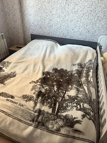 - İki nəfərlik çarpayı başlığı: minimal dizayn, tünd boz başlıq. Yanında uyğun tərzdə kiçik tumbanın olması görünür.