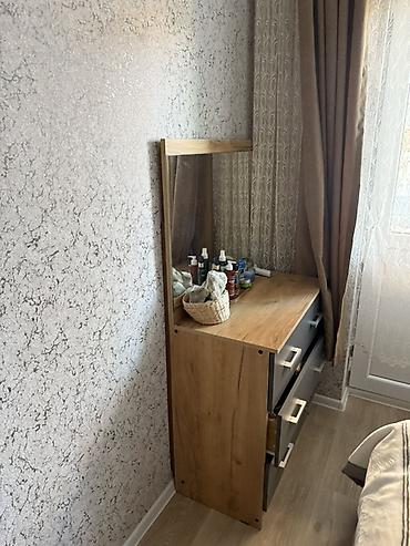 - Rəfli güzgülü komod: 3 geniş çəkməcə, üst hissədə kosmetika və aksesuarlar üçün səth, dikdörtqan güzgü. Korpus açıq palıd tonunda, önlər tünd boz rəngdə, metal tutacaqlar.