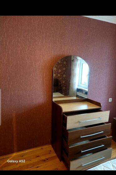 - Tualet masaslı komod: yarımdairəvi böyük güzgü, üst səthdə kosmetik-ləvazimat üçün açıq sahə, geniş metal tutacaqlı 5 çəkməcə.