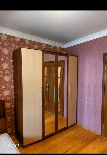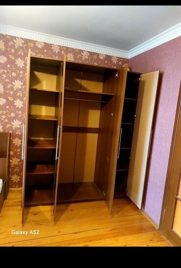 - Dörtqapılı qarderob şkafı: orta hissəsi güzgülü, uzun asılqan bölməsi, kənarlarda çoxsaylı rəflər; hündür metal tutacaqlar.