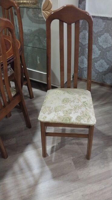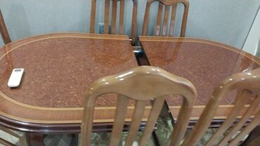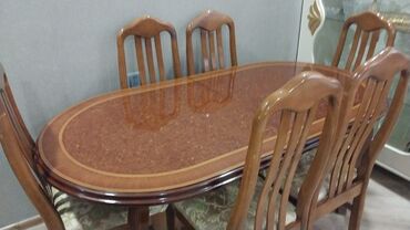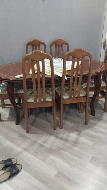 Bu dəstə bir masa və altı stul daxildir. Masa tünd qəhvəyi rəngdədir və düzbucaqlı formada, sadə, funksional dizayna malikdir. Stullar masanın rənginə uyğun tünd qəhvəyi parça ilə örtülmüşdür və kü...
