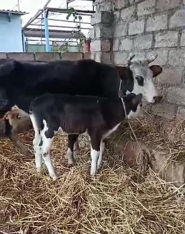 Satılır: inək balası ilə Ünvan: Kürdəmir - 1-ci balasıdır - Gündə 5/6 litr süd verir - Şəkildə bala əmizdirir, sağlam görkəmli heyvandı