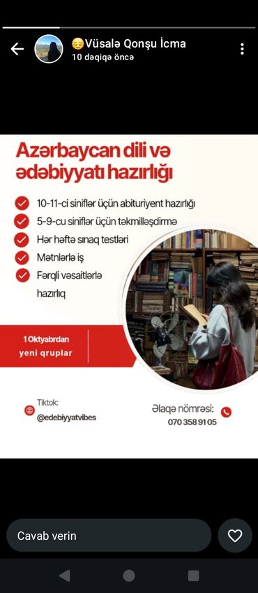 Провожу занятия по математике 2 раза в неделю до 9 класса онлайн. Те кто запишется сейчас оплата 50 манат(индивидуально). Дополнительно: каждое воскресенье будут проводиться тестовые занятия в груп...
