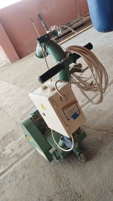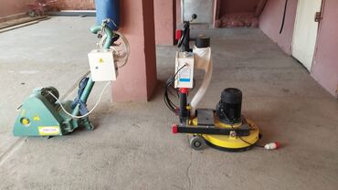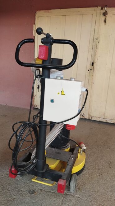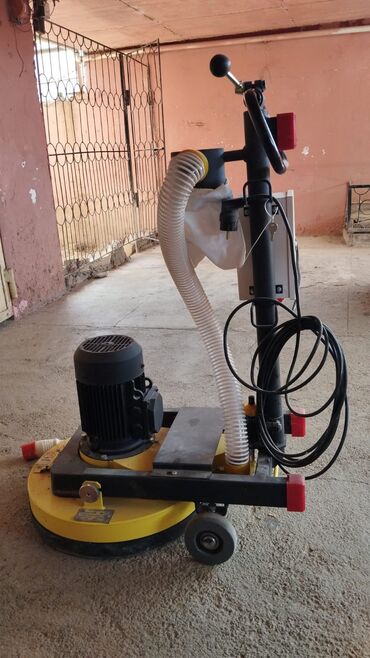 - Beton səthlərin hamarlanması/cilalanması üçün disk tipli, elektrik mühərrikli maşın (sarı gövdə, təkərli şassi). Tozun çəkilməsi üçün hortum və toplanma kisəsi, idarəetmə paneli, start/stop düymələri və 220/380V sənaye tipli fiş.