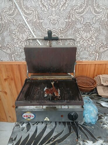 - Kontakt qril/sandviç presi: Çuqun qabırğalı üst-alt plitələr, mexaniki temperatur tənzimləyici düymə, işıq göstəricisi. Sendviç, panini, toyuq, ət və tərəvəzlərin sürətli qril olunması üçün uyğundur. Güclü metal gövdə, istiliyədavamlı tutacaq.