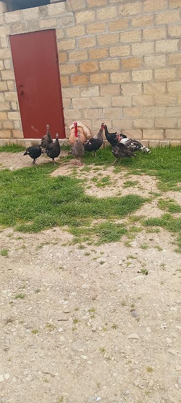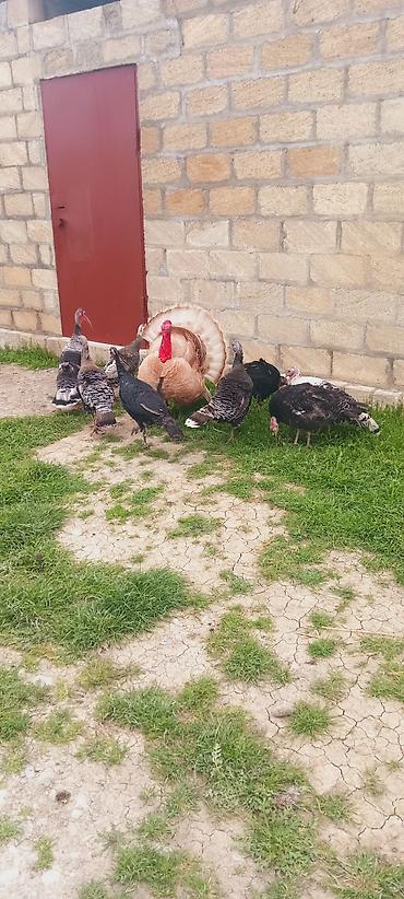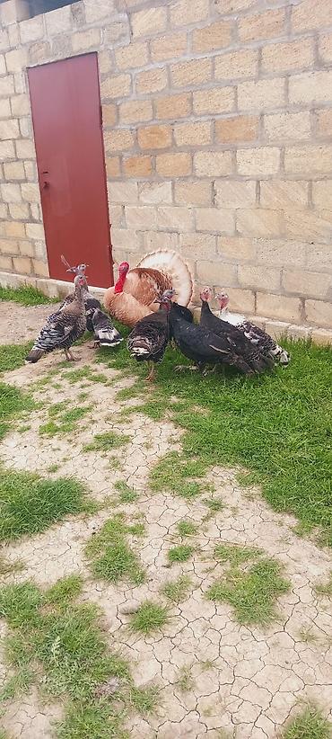 tecılı satılır Təsvir: - Açıq həyətyanı şəraitdə bəslənmiş hinduşkalar. - Rəngləri: əsasən ağ fon üzərində qara/boz zolaqlı naxışlar; erkək fərddə iri, yelpikvari quyruq, qırmızı işvə və mavi baş...