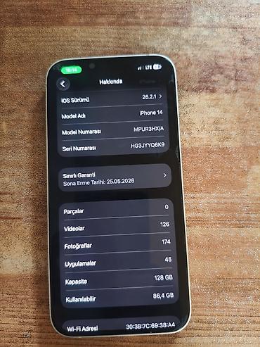 IPhone 14 – 128 GB, ağ rəng Texniki xüsusiyyətlər: - Model: iPhone 14 (MPUR3HX/A) - Yaddaş: 128 GB - Pil: 84🔋 - iOS versiyası: 16.2.1 (şəkildə “26.2.1” kimi görünür, cihazda mövcud versiya ekran g...