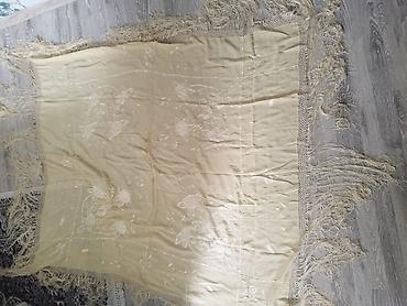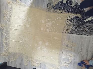 - Bej rəngli böyük şal: Kənarları əl işinə bənzər tor naxışlı və uzun saçaqlı, üzərində incə ağ çiçək-applikasiya və naxışlar. Dördkünc formaya yaxın, otaq və ya çiyin üstü örtü kimi istifadə oluna bilər.