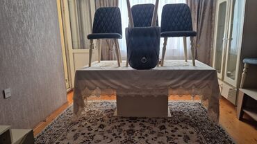 - Yumşaq oturacaqlı 4 ədəd stul: mavi rəng, romb tikişli döşəmə, arxa hissədə dekorativ halqa, ağ rəngli ayaqlar.