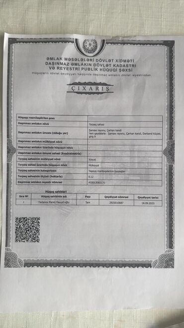 5 sot, Kənd təsərrüfatı, Mülkiyyətçi, Kupça (Çıxarış), Bələdiyyə