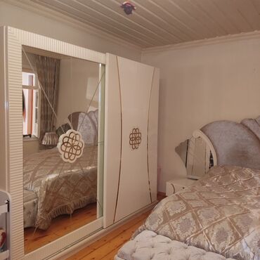 Müasir dizaynlı yataq otağı mebel dəsti Tərkib: - Geniş çarpayı: yumşaq panel başlıq, ağ-beton teksturalı və ağ korpus, taxta dekor elementləri. - 3 qapılı qarderob: mərkəzdə tam boy güzgü panellə...