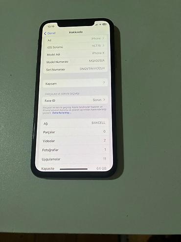 Apple iPhone X – 64 GB, Space Gray Xüsusiyyətlər: - Model: iPhone X (MQAQ2LL/A) - Yaddaş: 64 GB (mövcud: 52.57 GB) - Rəng: Space Gray - iOS versiyası: 16.7.15 - Face ID dəstəyi - Ekran: 5.8" Super...