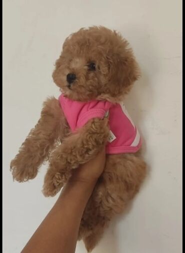 Mini toy pudel balası - Cins: Toy/Mini Poodle - Rəng: Açıq qızılı/abrikos - Xüsusiyyətlər: Hipoallergen yun (tük tökmür, qoxu saxlamır), yumşaq qıvırcıq tük örtüyü, kiçik ölçülü bədən quruluşu, ağ...