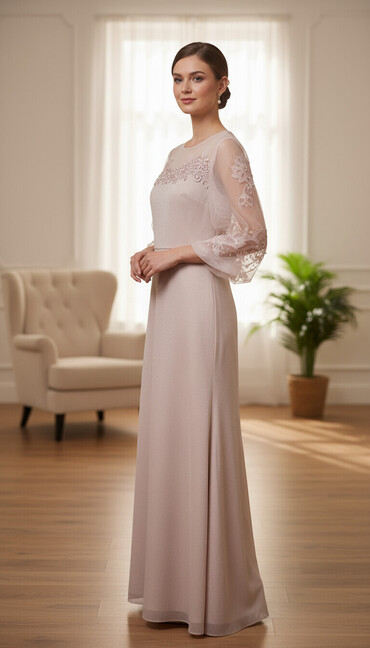 Zərif ziyafət/libas - Rəng: toz-çəhrayı (lilac tonlarında) - Model: uzun, A-kəsimli, yüngül flarlı ətək - Parça: şəffaf tül üst qat, incə romb naxışlı; altlıqla birlikdə - Yaxa: V-kəsim - Qol: 3/4...