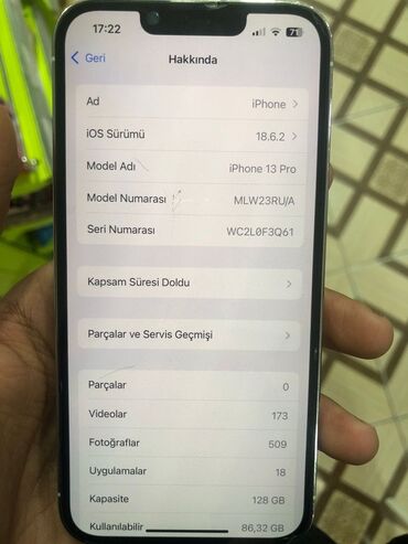 - Kamera: Üçlü arxa kamera sistemi + LED fləş; “Hakkında > Parçalar ve Servis” bölməsində “Yeni bir arka kamera algılandı” bildirişi görünür