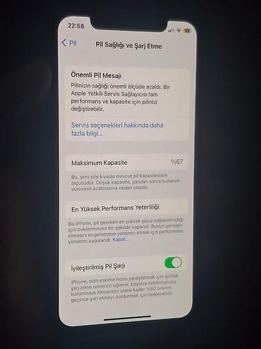 - Pil məlumatı (ekran görüntüsünə əsasən): Maksimum tutum 67%, “İyileştirilmiş Pil Şarjı” açıq, “En Yüksek Performans Yeterliliği” bölməsi mövcuddur