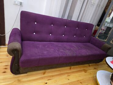 Bənövşəyi rəngli yumşaq parça üzlü üç nəfərlik divan.