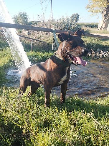 Amerikan Pit Bull Terrier, qəhvəyi rəng (sinədə ağ ləkə). Erkək, güclü sümük quruluşu və əzələli bədən. Qısa, parlaq tük örtüyü; qulaqlar kəsik formanı xatırladır. Boyunluqda möhkəm, eni geniş baş ...