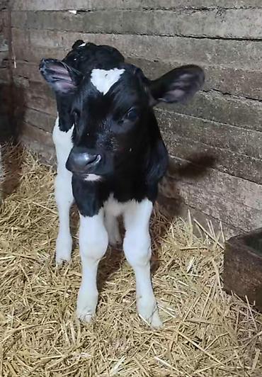 - Yaş: yeni doğulmuş/çox gənc buzov (şəkildə tövlədə, saman üzərində)