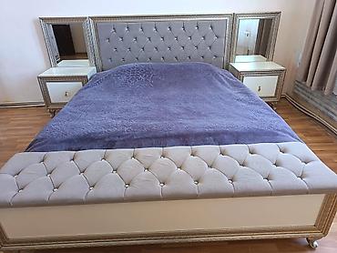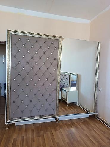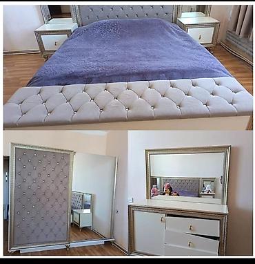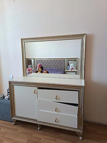 Yataq dəsti – 850 AZN Ünvan: Qaraçuxur Komplekt: - Bazalı taxt: yumşaq başlıq, dekorativ qızılı elementlər. Matras üstündə verilir. - 3 qapılı şkaf: iki güzgülü qapı, aşağıda əlavə çekmecələr, q...