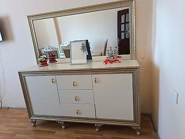 • Geniş komod və iri ölçülü üst güzgü (3 çekmece + sürgülü qapalı bölmə, qızılı dekorlu tutacaqlar)