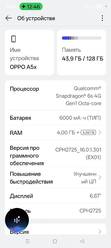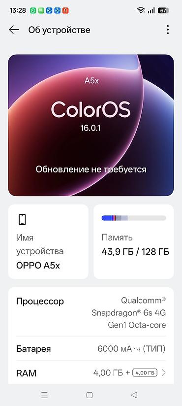 OPPO A5x (Model: CPH2725) - İşlətim sistemi: ColorOS 16.0.1 - Prosessor: Qualcomm Snapdragon 6s 4G Gen1, 8 nüvəli - Ekran: 6.67" - Daxili yaddaş: 128 GB (hazırda 44.2 GB istifadə olunub) - Operati...