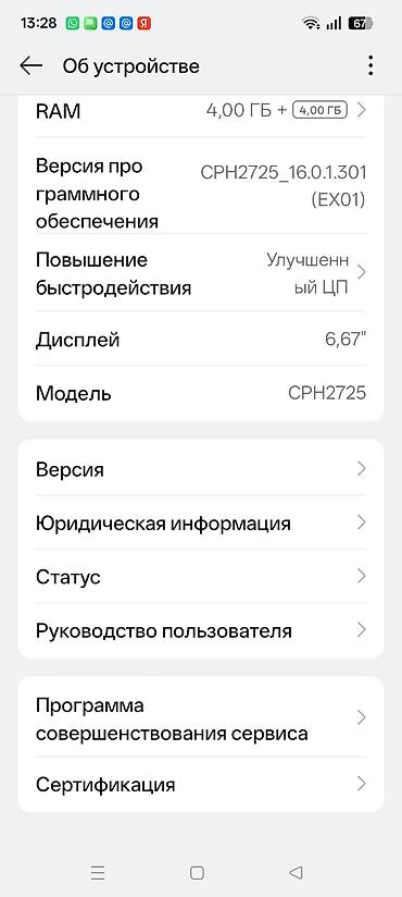 OPPO A58 (Model: CPH2577) – smartfon - Ekran: 6.72 düym böyük displey - Yaddaş: 128 GB daxili yaddaş (görünən: 44.4 GB istifadə olunub) - RAM: 8 GB + 4 GB əlavə virtual RAM - Prosessor: MediaTek H...