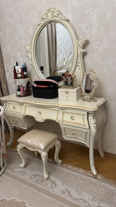 Krem rəngli, klassik üslubda yataq otağı mebel dəsti. Dəstə oyma naxışlı bəzəkləri olan dördqapılı dolab, böyük çarpayı və güzgülü makiyaj masası daxildir. Dolabın mərkəzi hissəsində böyük güzgü, altında isə iki siyirtmə mövcuddur. Makiyaj masası güzgü və beş siyirtmə ilə təchiz olunub. Bu mebel dəsti klassik interyerlər üçün uyğundur.