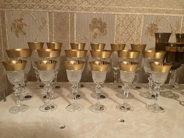 Zərif bəzəkli şərab qədəhləri dəsti – 6 ədəd - Material: şəffaf şüşə, qızılı rəngdə dekor - Dizayn: üst kənarda eni geniş qızılı haşiyə (yunan naxışları ilə), gövdədə relyefli ornament və medalion...