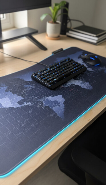 - Dizayn: Qlobal xəritə naxışlı geniş səth (klaviatura + siçan üçün kifayət qədər böyük).