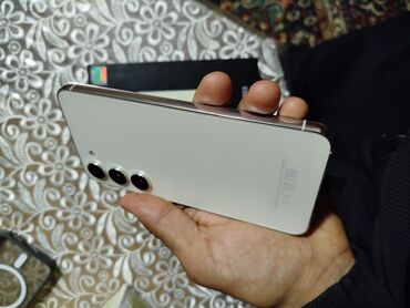 Samsung Galaxy S23 (yaşıl rəng) – qutu və aksesuar etiketləri ilə. Xüsusiyyətlər: - Ekran: tam ekran, mərkəzi ön kamera dəliyi ilə. - Korpus: düz kənarlı dizayn, metal çərçivə, sağ tərəfdə səs və ...