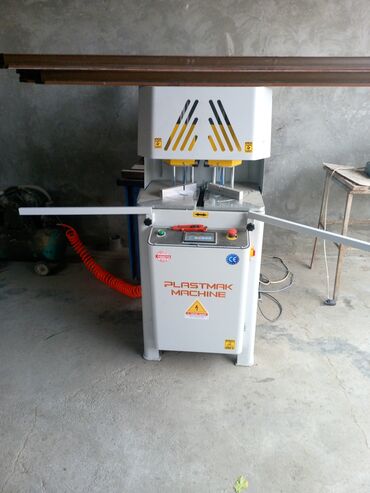 - PLASTMAK Machine – iki başlı künc presi: profil künclərinin birləşdirilməsi üçün pnevmatik qurğu, idarəetmə paneli, təcili dayandırma düyməsi, istiqamətləndirici xətkeşlər və dayaq qolları. CE nişanlı, təhlükəsizlik xəbərdarlıqları ilə.