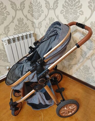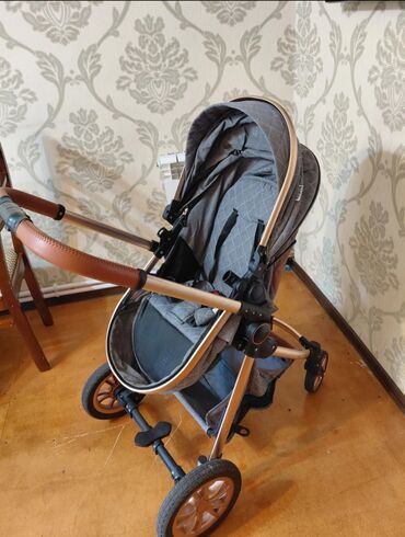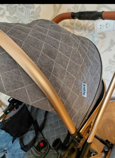 Kidilo markalı, dəri tutacaqları və romb naxışlı boz parça ilə qızılı çərçivəyə malik uşaq arabası. Bu arabada rahat tənzimlənən oturacaq və beş nöqtəli təhlükəsizlik kəməri var. Təkərləri sayəsində asanlıqla idarə oluna bilir və günlük gəzintilər üçün uyğundur.