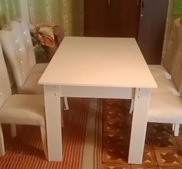 - Dəst tərkibi: düzbucaq formalı masa və eyni üslubda yumşaq oturacaqlı 6 ədəd stul (şəkillərdə görünür).