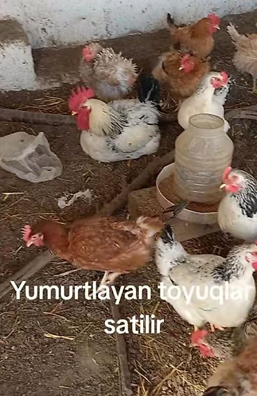 Toyuqlar 13 Manat xoruz 25 Manat - Bir neçə yumurtacı toyuq və xoruzdan ibarət qarışıq sürü - Rənglər: qırmızı, qara, ağ, ləkəli - Cinslər qarışıqdır; yumurta yönümlü yerli/toxlu tip - Gündəlik ye...