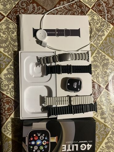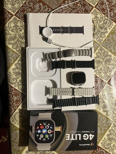 Ağıllı saat dəstiçox ucuza 5 6 dəfə taxılıb işlədilməyib - Korpus: kvadrat formalı, metal çərçivə, sağ tərəfdə tac və əlavə düymə. - Ekran: toxunmaya həssas, kənarları yuvarlaq ekran. - Qutuda gələ...